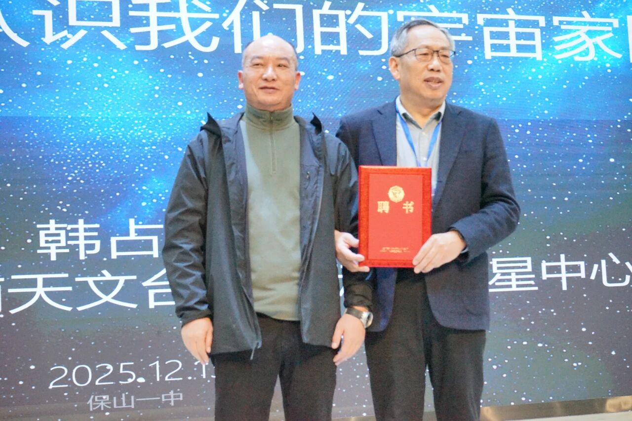 报告开始前,云南省保山第一中学校长付飞代表学校,向韩占文院士颁发“校外科技辅导员”聘书。