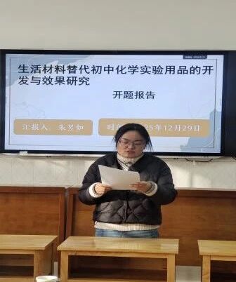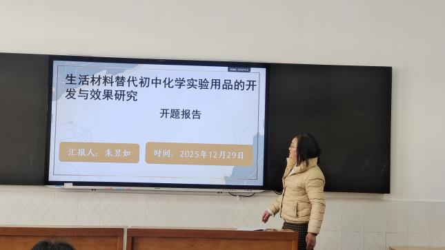 朱昱如老师主持的课题为《生活材料替代初中化学实验用品的开发与效果研究》,在开题论证过程中,主要围绕课题研究背景、目标内容、方法步骤及预期成果等进行了汇报。评审专家在听取陈述后,对课题的实践意义与研究框架予以认可,并就研究方向、实施路径等提出了具体建议。答辩结束后,课题组及时组织研讨,结合专家意见进一步优化研究方案。