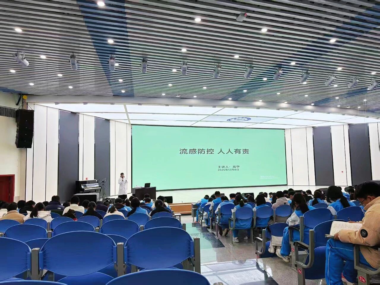 12月,德育处副主任田仁杰老师主持召开全体班委会议,会议聚焦班委责任、纪律与安全问题,明确要求全体班委要严于律己,发挥模范带头作用,在班级管理中做到公正负责,同时绷紧安全弦,及时排查班级内的安全隐患。本次会议特别邀请医务室负责人高华医生,带来“流感防控,人人有责”主题讲座。高医生从流感的传播途径、临床表现、预防措施等方面进行专业讲解,重点普及勤洗手、常通风、科学佩戴口罩等防护知识,还介绍了校园流感应急处理流程。班委们认真记录要点,表示将把防控知识传递给每一位同学,共同守护校园师生的健康安全。